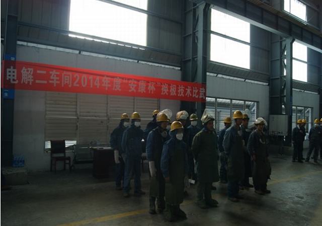 青海物產(chǎn)工業(yè)投資有限公司全面啟動(dòng)"安康杯"競賽活動(dòng)。2014年4月15日上午電解二車間舉行了"安康杯"換極技術(shù)比武大賽。公司副總經(jīng)理張?jiān)手遥笨偨?jīng)理、工會主席張秉瑜,總經(jīng)理助理秦建峰出席了開幕式。